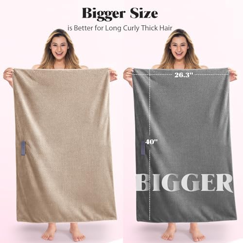 MABAO 2 Pack Microfiber Hair Towel Wrap for Women, Quick Dry Hair Turban Towel with Elastic Band, Microfiber Plopping Towel for Curly Hair, Stocking Stuffers for Women (Gray, Camel)
