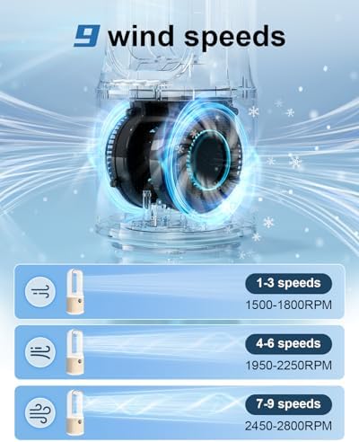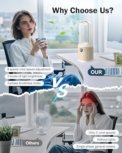 MEIIS desktop fan, small silent bladeless fan with 9-speed adjustment and 3 lighting modes, 14 inch USB rechargeable, with 5000mAh battery, 60 ° swing cooling fan, suitable for office, living room, be