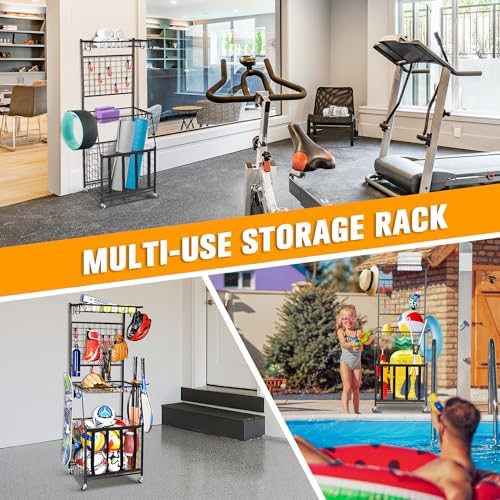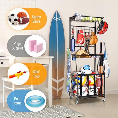 PLKOW Sports Equipment Storage for Garage, Indoor\/Outdoor Sports Rack for Garage, Ball Storage Garage Organizer with Basket and Hooks,Toy\/Sports Gear Storage