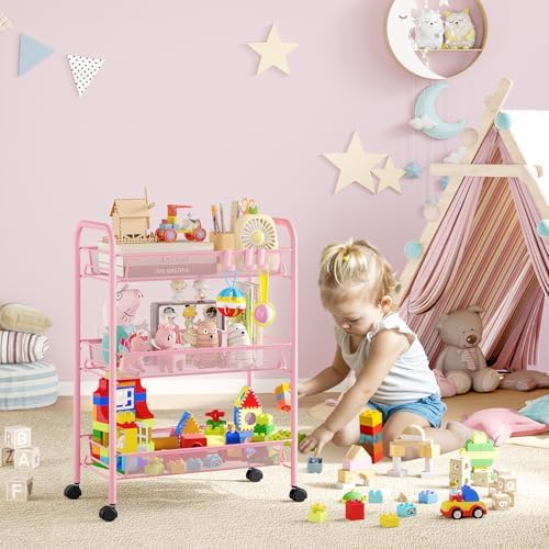 TOOLF 3 Tier Rolling Utility Cart - Durable Metal Design Pink Utility Cart, Storage Trolley on Wheels with 3 Hooks, Perfect for Kitchen, Bathroom & Laundry Room Organization