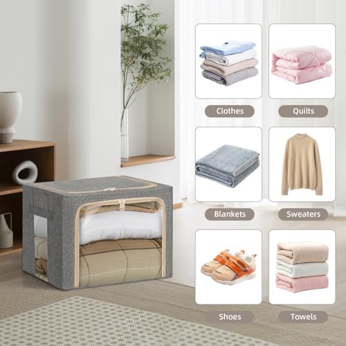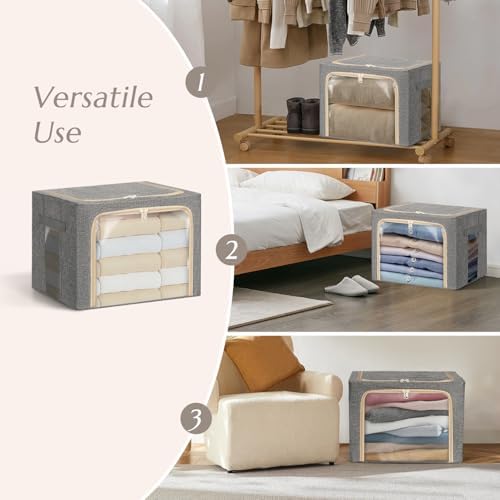 LOVSTORAGE 3-Pack Clothes Storage Bags, Foldable Storage Bins with Metal Frame, Clear Window, Reinforced Handles, Durable Non-Woven Fabric for Clothes, Bedding, Blankets, 40L, Gray
