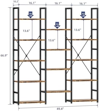【TRIPLE COLUMN MULTIFUNCTIONAL BOOKSHELF】: Featuring 14 open shelves, this bookshelf provides ample space to store books, photo albums, alarm clocks, potted plants, and various decorations. It serves as both a functional storage unit and a stylish display for your beloved collections. The minimalist and elegant design complements a variety of home decor styles, making it a versatile addition to any study room, bedroom, living room, dining room, or office. Dimensions: 49.4" L x 10.2" W x 66.9" H. 【HIGH QUALITY BOOKSHELVES】: Constructed from premium metal and selected particle board, our contemporary metal bookcase offers high stability and long service life. The top-notch anti-rust coating gives the shelf a sophisticated appearance. Its waterproof and scratch-proof boards can be easily cleaned with a wet rag. Featuring an excellent metal frame and thick solid panels, each shelf can hold up to 70 lbs. 【ADJUSTABLE SHELVES】: Unlike fixed shelves that limit the height of display items, our bookshelf features an adjustable design. You can easily modify the position of each shelf to accommodate items of various sizes, allowing you to customize a bookshelf that perfectly suits your needs. 【ADJUSTABLE FEET】: This bookshelf features adjustable feet for leveling on uneven floors, ensuring stability and preventing floor scratches when moving the shelf. The "X" support bar at the back provides additional stability, protecting your displayed items. No shaking No wobbling. 【SUPER EASY TO INSTALL】: This wide storage bookshelf requires only 7 steps to assemble. Detailed instructions and all necessary tools are included, making the installation process quick and straightforward. 【SMILEY CUSTOMER SERVICE】: Welcome to contact us! Your satisfaction is our top priority. If you encounter any issues regarding product quality or have any problems during your purchase, we are here to help. We guarantee easy and fast responses, as well as replacements when needed.