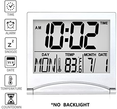 Betus Digital Travel Alarm Clock - Foldable Calendar Temperature Timer LCD Clock with Snooze Mode - Large Number Display, Battery Operated - Compact Desk Clock(Silver, No Backlight)