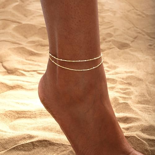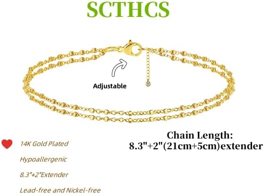 SCTHCS Gold\/Silver Ankle Bracelets for Women Dainty14K Gold Plated Waterproof Cuban Bead Chain Sets Layered Non Tarnish Summer Beach Bracelets 8.3+2 Inch Adjustable for Womens Jewelry Gifts