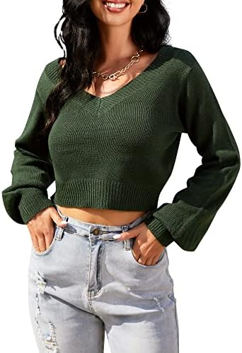 ZAFUL Women's Cropped Sweater V-Neck Long Sleeve Crop Sweater Pullover Jumper Knit Top