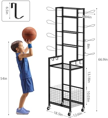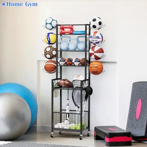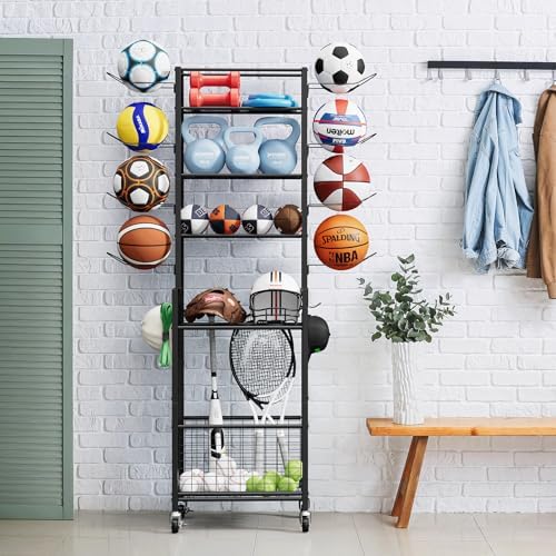 OYEAL Freestanding Ball Rack with Wheels Garage Basketball Storage Cart Outside Sports Equipment Organizer Ball Holder with Storage Baskets for Basketball, Soccer, Volleyball, Football, Black