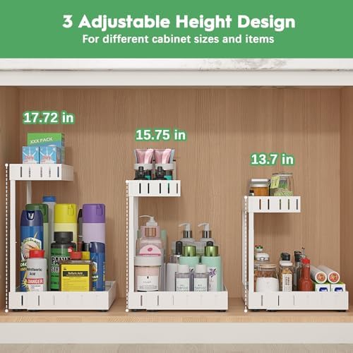 REALINN Under Sink Organizer, 2 Tier Expandable Under Cabinet Organizer, Heights Adjustable Pull Out Storage for Kitchen Bathroom Laundry, White, 2 Pack