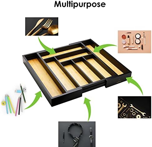 Cozee Bay Bamboo drawer organizer, utensil holder, silverware organizer, and adjustable cutlery tray with drawer dividers, for kitchen, office desk, and bathroom storage (Black)