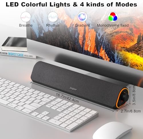 SOULION R50 Bluetooth Computer Speakers, 3.5mm PC Sound Bar for Desktop Monitor, Wired USB Powered & Colorful LED Lights with Switch Button, Surround Sound Soundbar PC Spearkers for Computer