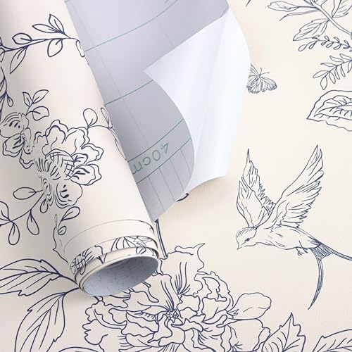 Froluya Cream White and Blue Floral Wallpaper Peel and Stick Wallpaper 17.7"x118.1" Vintage Floral Peel and Stick Wall Paper Removable Boho Self Adhesive Contact Paper for Bedroom Bathroom Vin