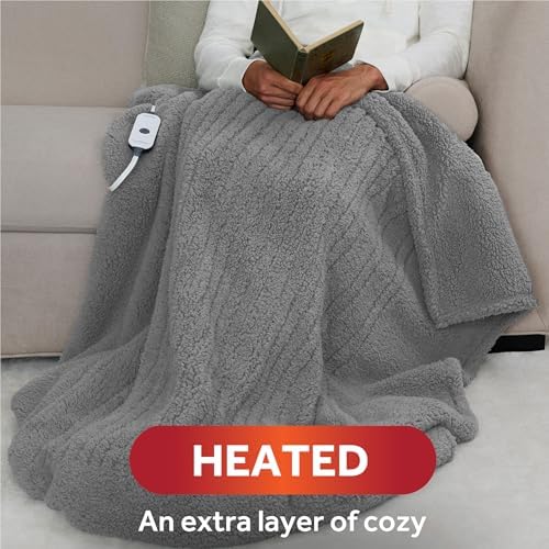 Sunbeam Royal Sherpa Foot Pocket Heated Throw Electric Blanket, 50" x 60", 4 Heat Settings, 4-Hour Auto Shut-Off, Warming Throw for Couch or Bed, Fast Heating, Machine Washable, Grey