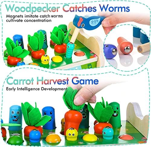 Amtreen 6-IN-1 Wooden Montessori Toys for 1 Year Old, Mole-Tapping Game Play the Xylophone Frog Clock Carrot Harvest Game Spinning Gear, Toddler Toys Aged 1-4, Baby Toy Gift for Early Learning