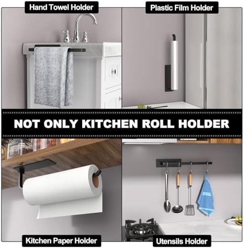 Paper Towel Holder - Self-Adhesive or Drilling, Matte Black, Upgraded Aluminum Kitchen Roll Dispenser Under Cabinet, Lighter but Stronger Than Stainless Steel!