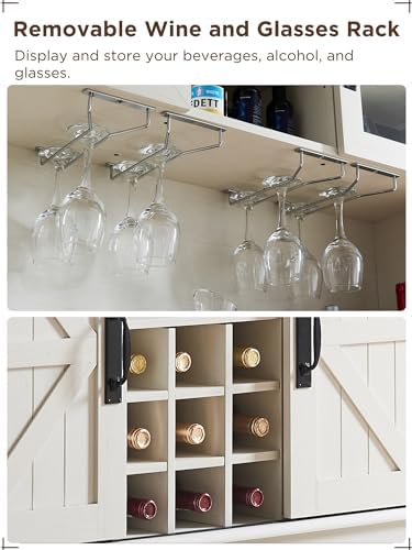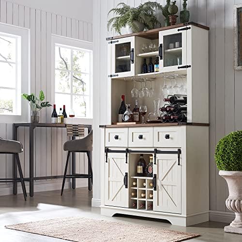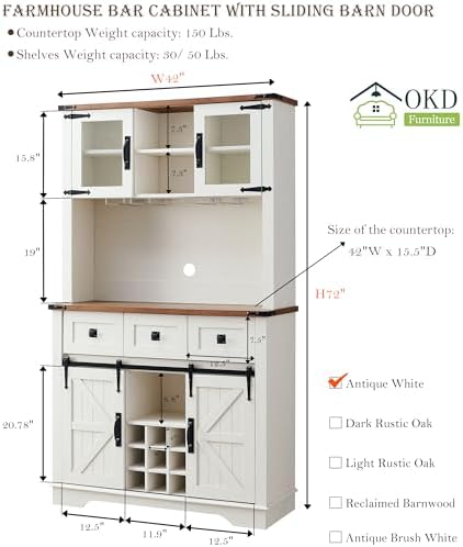 OKD 72" Farmhosue Bar Cabinet with Sliding Barn Door, Large Kitchen Buffet with Hutch w\/Wine & Glasses Rack, 3 Drawers, 12 Storage Shelves, Rustic Coffee Bar Sideboard Table, Antique White