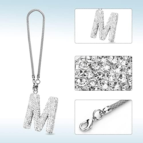 Initial Car Rear View Mirror Ornament Hanging Lucky Crystal Pendant Bling Car Accessories for Women Rhinestone Charm Auto Decoration (White M)