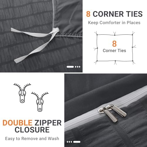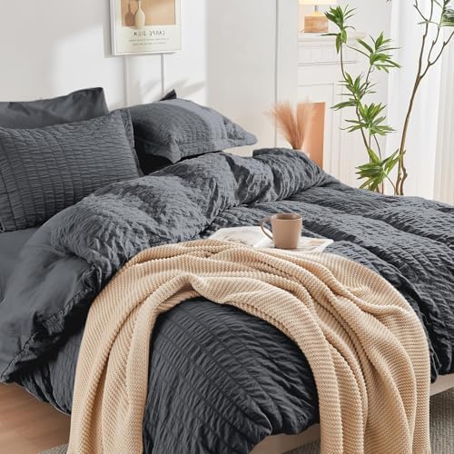 HYMOKEGE Dark Grey Duvet Cover Queen Size, Ultra Soft 3-Piece Seersucker Duvet Cover Set with Zipper Closure, Soft Brushed Microfiber Bedding Set with 8 Corner Ties (90"x90", 2 Pillowshams)