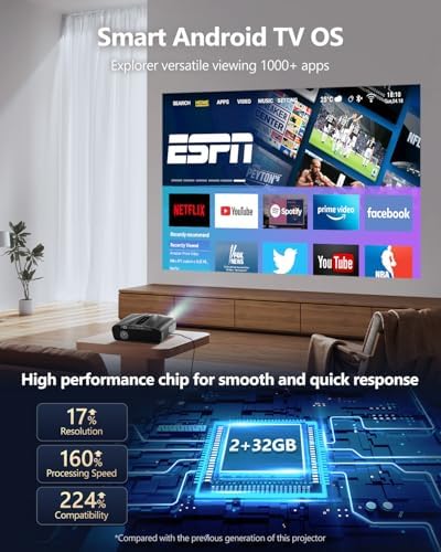 4K Projector Auto Focus HDR WiFi 6, Smart Daylight Projector 4K High Lumen 1800 ANSI LED 1080P Ultra HD Ceiling Home Theater Karaoke Movie Gaming Indoor Outdoor with Bluetooth HDMI USB Ethernet Apps