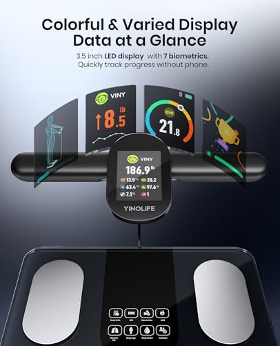 YINOLIFE Smart Scale with BMI, Body Fat, Muscle Mass, 8 Electrode Weight Scale with 28 Full Body Composition, Scale for Body Weight with Retractable Handle, Large Color Display, 14", Rechargeable