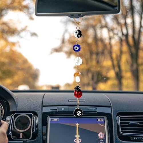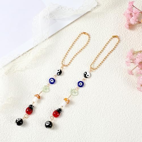 2 Evil Eye Cars Hanging Ornament, Good Luck Car Decor Charm for Rear View Mirror Accessories, Cute Boho Cars Decor Accessories Evil Eye Charm, Yin Yang Four Leaf Clover 8 Balls Car Accessory