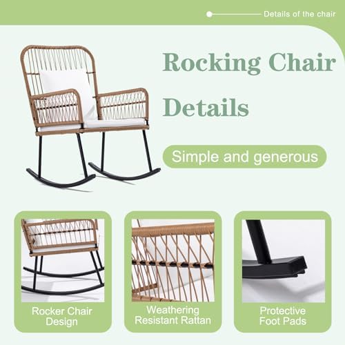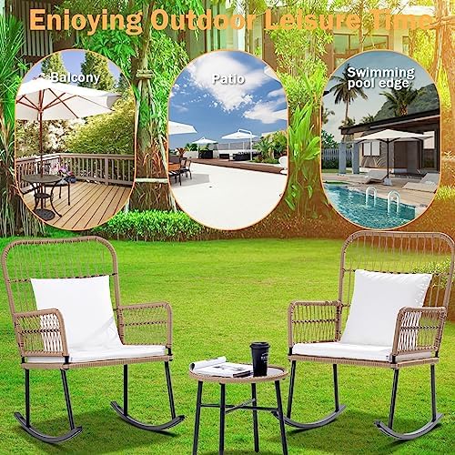 Outdoor Patio Rattan Rocking Chairs Furniture Set, Indoor High Back Rocking Chairs Set of 3, Balcony Chairs Set with Glass Coffee Table and White Cushions, Suitable for Balcony, Front Door, Porch