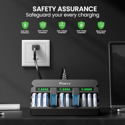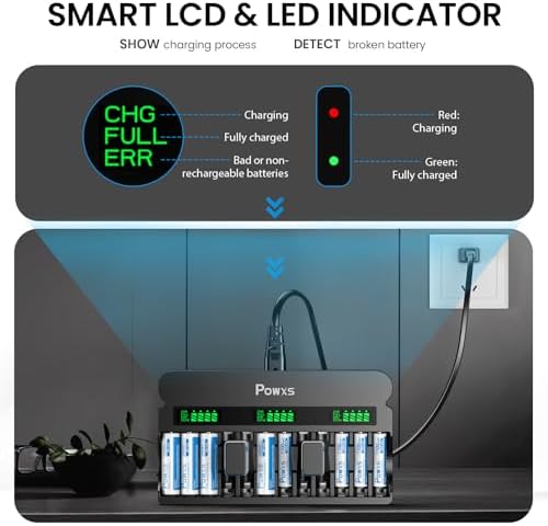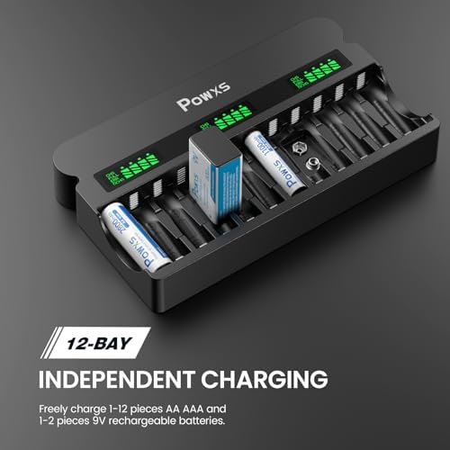 POWXS rechargeable AA AAA 9V battery charger, 1800mA high-speed, 12 slot independent battery charger, suitable for 1.2V nickel hydrogen nickel cadmium AA AAA rechargeable batteries and 9V lithium-ion