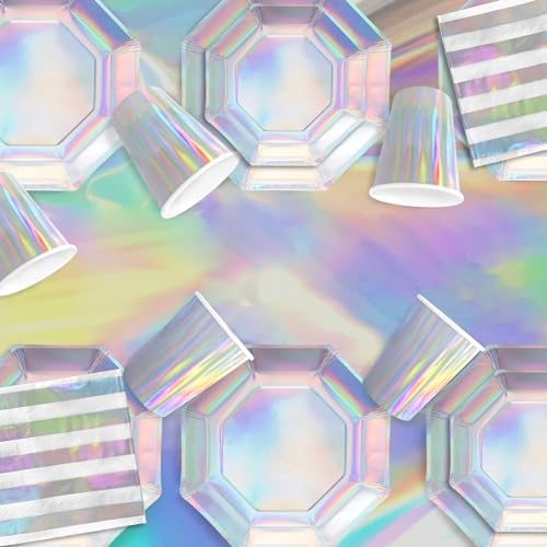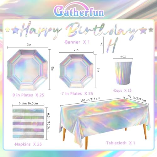 Iridescent Party Supplies - Disposable Paper Plates, Cups, Napkins, Tablecloth & Banner - Ideal for Mermaid Themed Events & Birthday or Wedding Party Decoration - Serves 25
