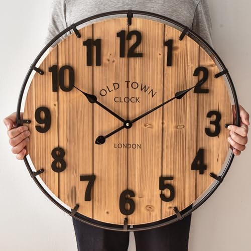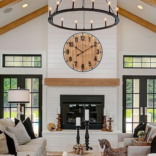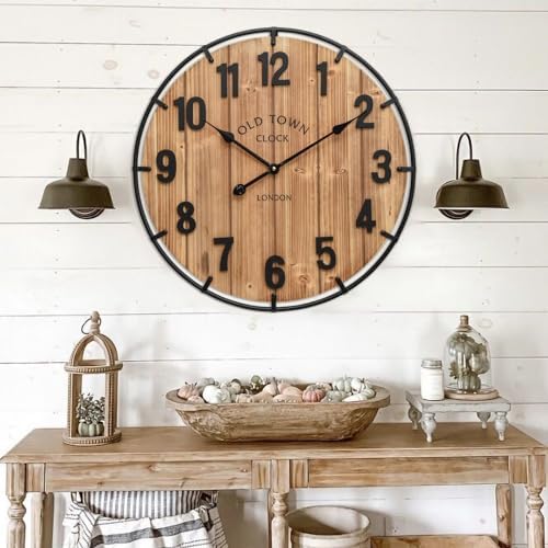 EMAX HOME Large Old Town Farmhouse Wall Clock 24 Inch Rustic Antique Wood with Metal Circle and Large Numerals Silent Battery Operated Wall Clock for Office Kitchen Bedroom Living Room