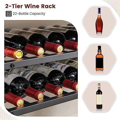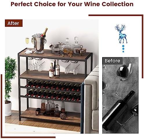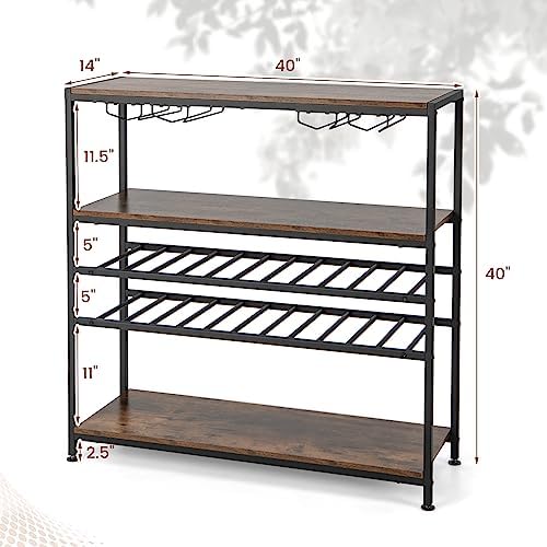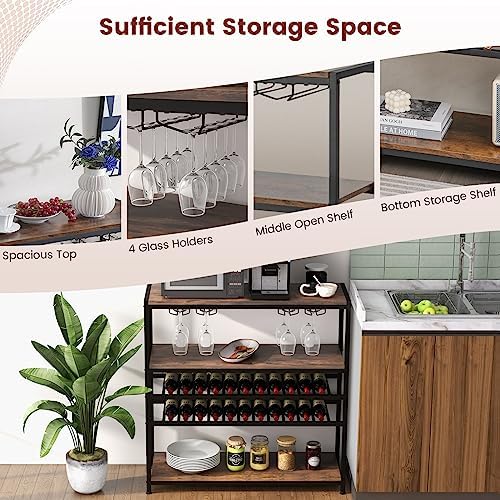 GOFLAME Industrial Wine Rack Table, Wine Bar Cabinet with 2-Tier Wine Rack, 4 Row Glass Holder and Storage Shelves, Freestanding Floor Liquor Storage Stand for Kitchen, Dining Room, Rustic Brown