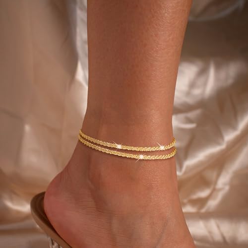 Robaice Ankle Bracelets for Women, Glitter Waterproof Adjustable Anklet for Women, 14K Gold Plated\/Sterling Silver Layered Anklets, Summer Beach Anklet Jewelry for Women Gift