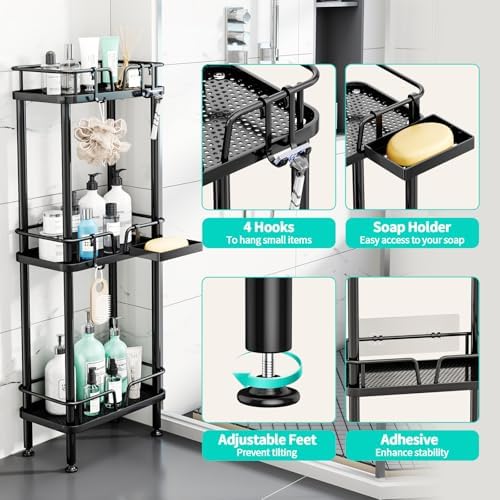 HapiRm Standing Corner Shower Caddy - 3 Tier Corner Shower Organizer with Soap Holder, Rustproof Stainless Steel Bathroom Shelf with 4 Hooks, Black