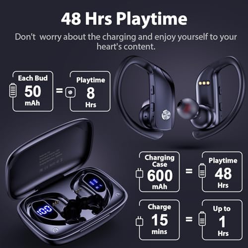 bmanl Wireless Earbuds Bluetooth Headphones 48hrs Play Back Sport Earphones with LED Display Over-Ear Buds with Earhooks Built-in Mic Headset for Workout Black