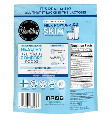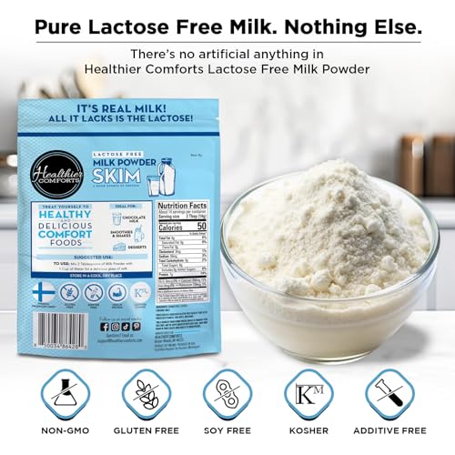 Healthier Comforts Lactose Free Skim Milk Powder High Protein, Fat Free, Non-GMO, rBST Hormone Free, Kosher, Gluten Free, No Fillers Baking, Coffee Creamer, Shakes Makes 14 cups (21 oz)