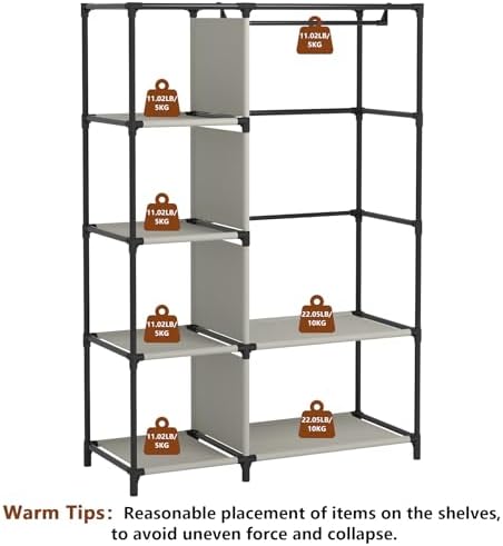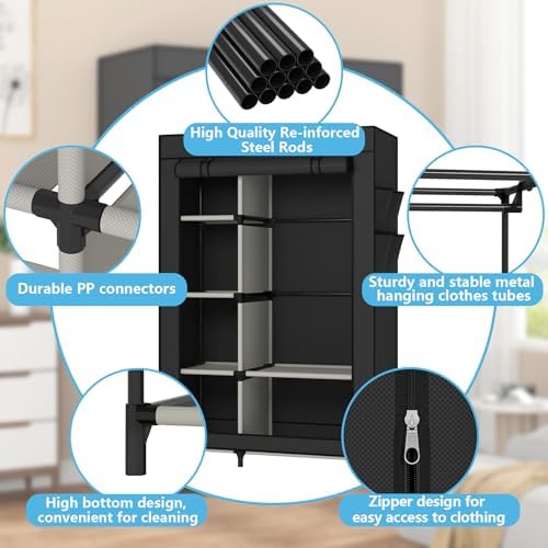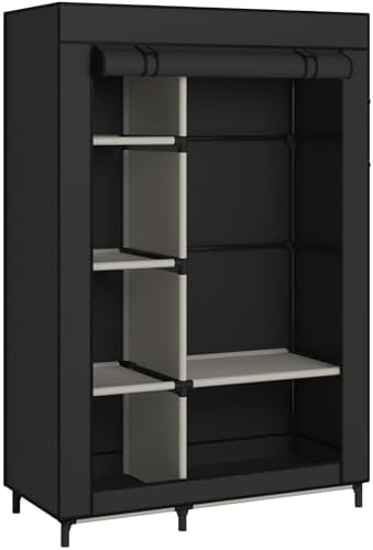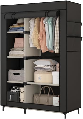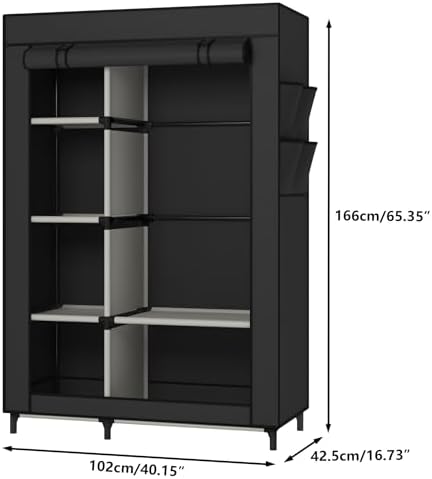 Calmootey Portable Closet Organizers, Clothing Storage, Wardrobe with 6 Shelves and Hanging Rod, Non-Woven Fabric Cover with 4 Side Pockets, Black