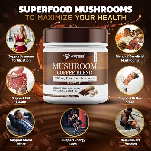 Mushroom Coffee, 90 Servings Organic Mushrooms Instant Coffea, Great Tasting Colombian Keto Coffee, 7 Superfood Mishrooms Lions Mane, Chaga, Reishi, Cordyceps, Maitake, Shiitake, and Turkey Tail