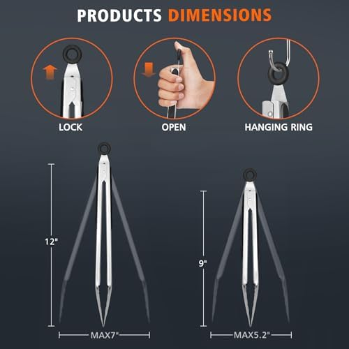 Hotec Stainless Steel Kitchen Tongs Set of 2 - 9" and 12", Locking Metal Food Tongs Non-Slip Grip