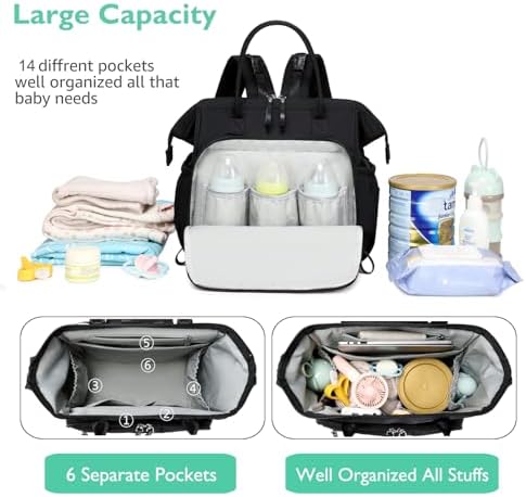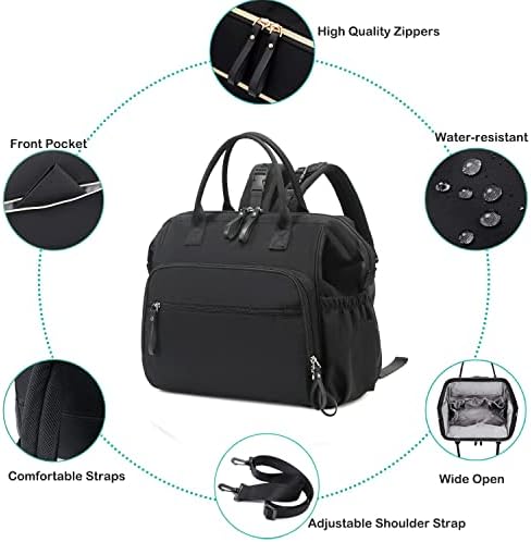 LORADI Convertible Diaper Bag Tote, Wide Open Top 14 Pockets Nappy Backpack with Stroller Buckle, Water-resistant (Black)
