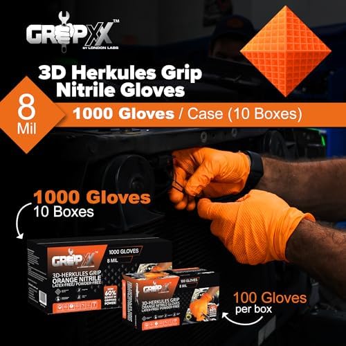 GRIPXX Herkules Grip Heavy Duty 8Mil Orange Nitrile Gloves,3D Raised Diamond Texture-Latex & Powder Free-Industrial, Mechanic