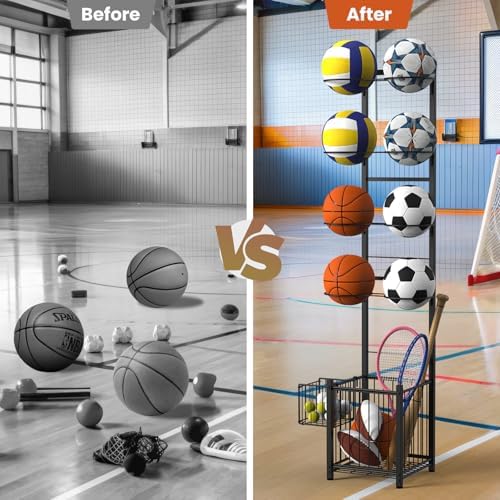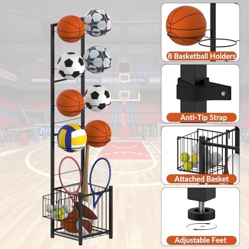 CADUKE Basketball Storage, Vertical Ball Rack for Garage, 8 Balls Sports Ball Holder for Basketball, Soccer, Volleyball, Football, Rackets in Garage, Indoor, Outdoor, Black