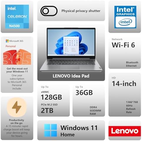 Lenovo IdeaPad 1 Everyday Laptop, 14" HD Display, 8GB RAM, 384GB Storage(128GB eMMC + 256GB PCIe), 1 Yr Office 365 Included, Intel Core Processor, Win 11 Home, Bundle with Thunderobot Wireless Mou