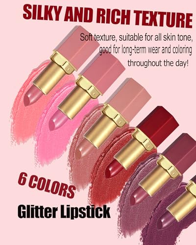 Glitter Lipstick Sets for Women Long Lasting,Light to Dark Shimmer Lipstick 24 Hour Waterproof Matte Lip Gloss Nude Pink Rose Red Brown Plum Color High Pigmented Sparkling Shiny Lip Stain Makeup Gift